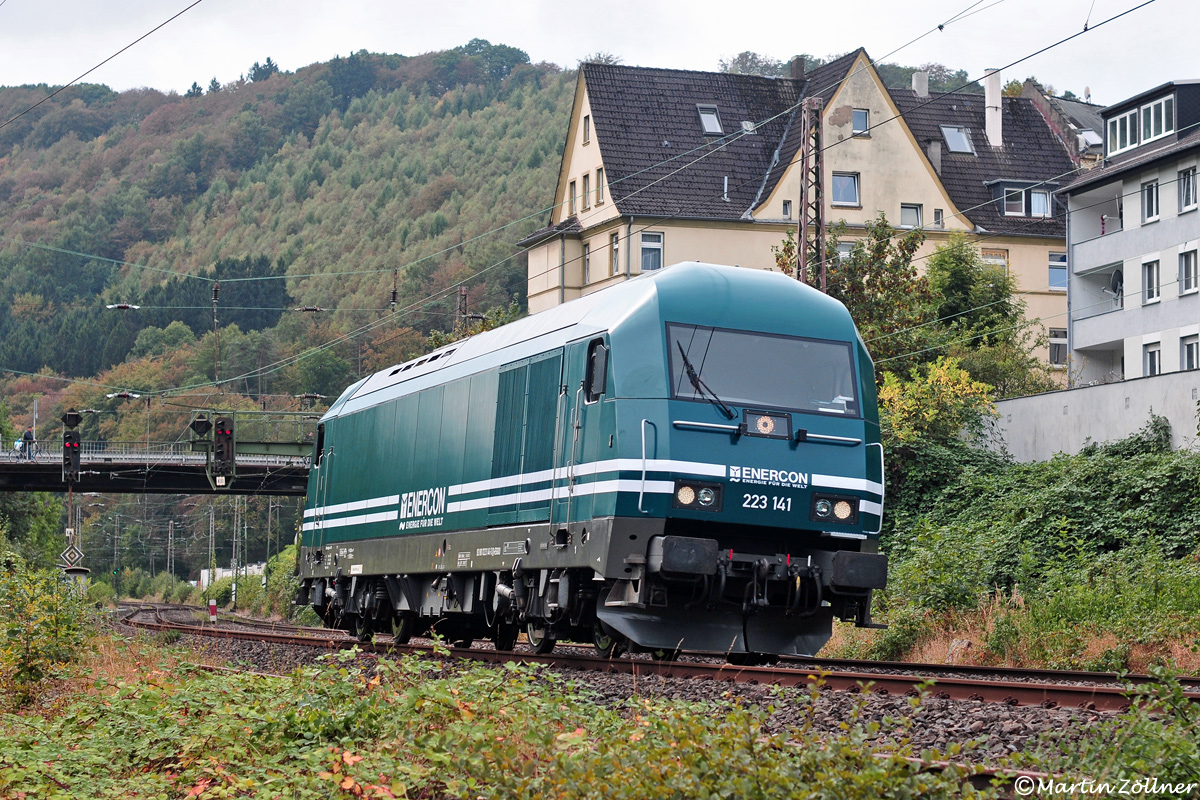 Am 30. September 2016 ist der Eurorunner 223 141 der e.g.o.o. lennetalabwärts auf dem Weg von Siegen, wo die Folienbeklebung bei der Firma Raildesign Bäcker durch eine Lackierung ersetzt wurde, zum Heimatstützpunkt Aurich. An diesem Freitagmittag konnte die Durchfahrt durch den ehemaligen Bahnhof Nachrodt bei "Hilfssonne" bildlich festgehalten werden, planmäßig kommen die e.g.o.o.-Loks seit 2010 nicht mehr auf der Ruhr-Sieg-Strecke zum Einsatz.
