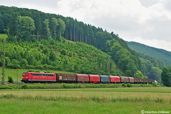 Den Leerzug 60750 von Finnentrop nach Wanne-Eickel bespannte 151 141 am Freitag, den 07. Juli 2017. In den Wiesen bei Teindeln stand Martin passend und fertigte diese Aufnahme bei der Vorbeifahrt an.