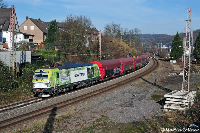 War sonst in den 2020er Jahren immer sonntags ein Coilzug von Hagen nach Kreuztal mit G2000 der KSW unterwegs, so fährt dieser im Jahre 2025 nun mit Duallokomotive der Dortmunder Eisenbahn. Am Montagmittag, den 03. Februar eilt 248 034 mit dem Grafitti-Planenexpress durch den ehemaligen Bahnhof Nachrodt.