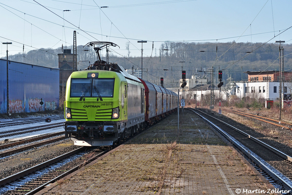 Am Montagmittag, den 03. Februar 2025 rollt der Schützzug von 248 037 der Dortmunder Eisenbahn bespannt durch den Letmather Bahnhof. An diesem Tag war keine zweite Lok zur Traktionsunterstützung über den Rothaarkamm erforderlich. Das ehemalige Bahnbetriebswerksgelände (rechts im Bild) wurde mittlerweile überbaut und somit einer anderen Nutzung zugeführt, unter anderem ist hier nun eine Ausbildungswerkstatt angesiedelt.