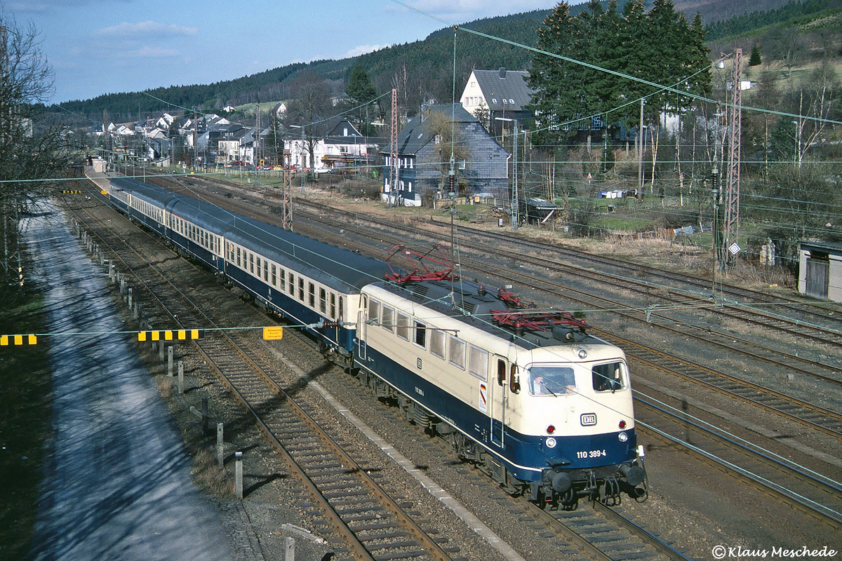 Im März 1985 stand Klaus Meschede in Welschen Ennest auf der Fußgängerbrücke über den Bahnhof und beobachtete die Frankfurter 110 389 mit ihrem artreinen Schnellzug bei der Durchfahrt ins Hessische.