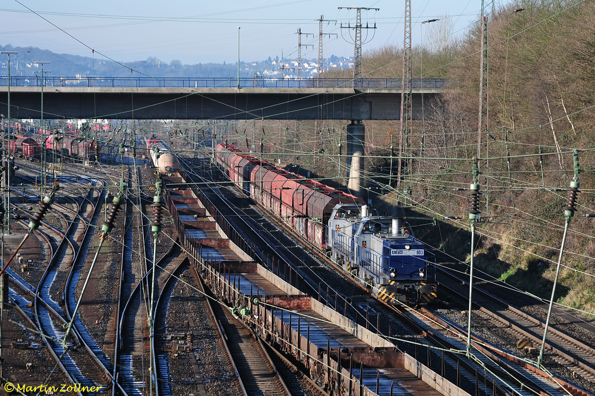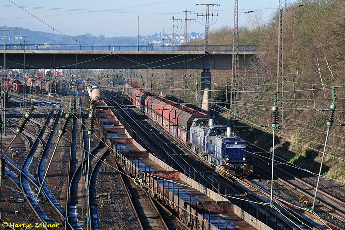 Vor einer Fuhre Kraftwerkskohle nach Wuppertal leistet RBH 803 ihrer Schwester RBH 805 am 13. Februar 2016 Vorspanndienste, um den Brocken auf der P-Bahn neben dem Rangierbahnhof Vorhalle südwärts zu bringen, während links daneben ein Mischzug von Hamm kommend einfährt. Die Szene wurde vom den Bahnhof überspannenden Fußgängersteg beobachtet.