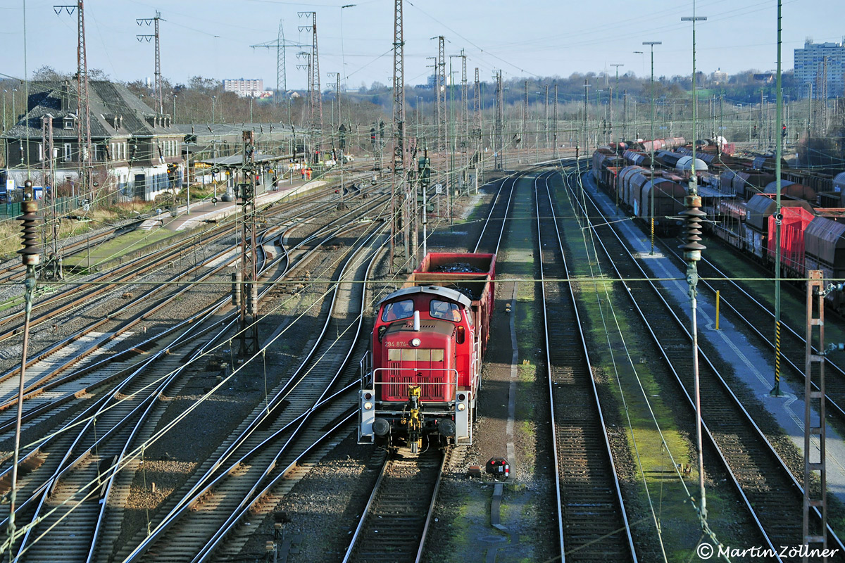 Am Vormittag des 29. Dezember 2015 hat 294 874 den Schrotthändler am Bahnhof Rummenohl im Volmetal bedient und kommt gerade auf der Rückfahrt über den Hagener Gbf mit zwei beladenen Eaos-Wagen wieder im Zielbahnhof Vorhalle an, beobachtet von der Fußgängerbrücke Reichsbahnstraße – Brüninghausstraße.