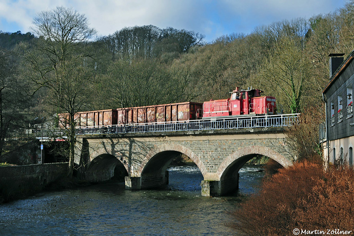 Auf dem Volmeviadukt in Hagen Dahl kam am 11. Dezember 2025 in der Mittagssonne der allerletzte DB Cargo-Güterzug aus Rummenohl gen Hagen Gbf gefahren. Martin war passend zur Stelle und lichtete die Zweiwagenfuhre mit Zuglok 363 235 für die Nachwelt ab. Aufgrund mehrerer Brückenschäden und dadurch heruntergesetzter Streckenklasse kam hier die letzten Monate noch mal eine V 60 zu Einsatzehren.