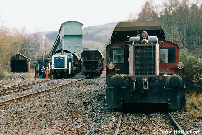 Am 02. Dezember 1994 besuchte Peter Hölterhoff den Anschluss der Basalt AG in Krummenerl. Neben 212 272 mit Personal war auch die BAG-Köf (ex DB 322 647) am Beladesilo im Einsatz auszumachen.