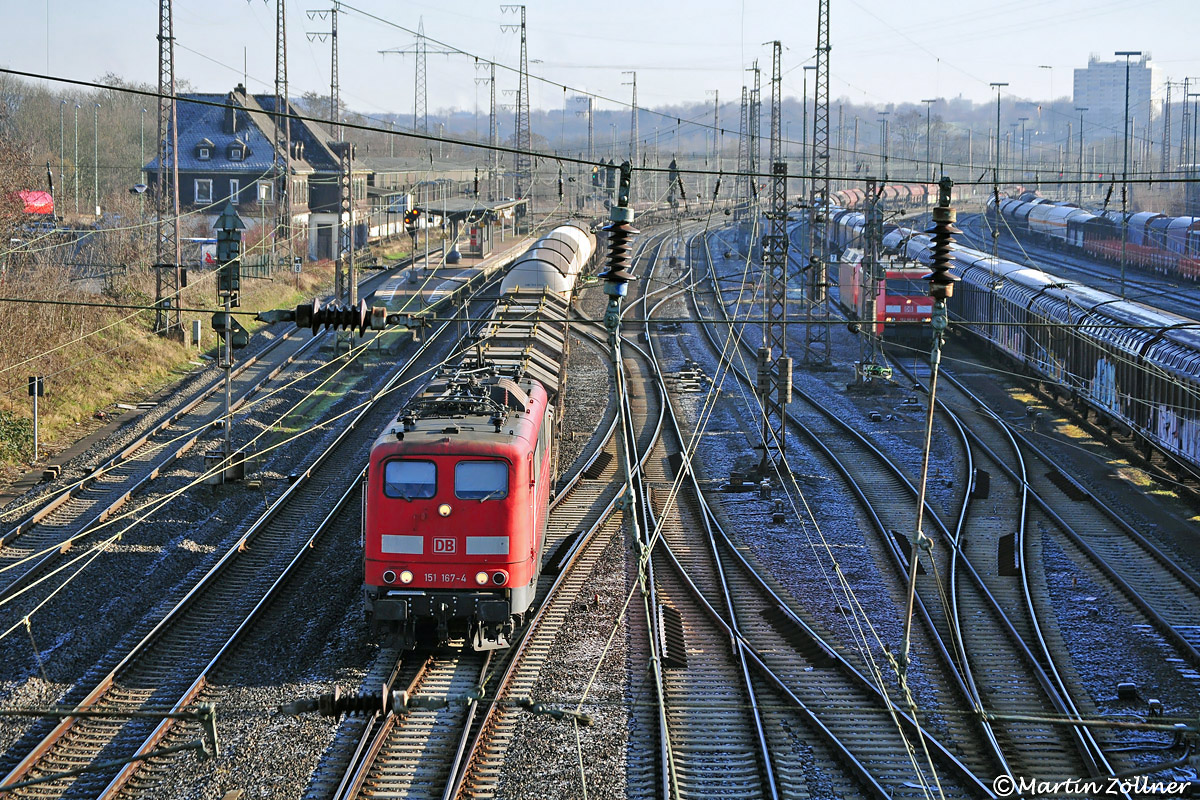 Nur noch wenige hundert Meter, dann hat 151 167 mit ihrem Mischer aus Seelze das Ziel, die Einfahrgruppe auf dem Ablaufberg in Hagen Vorhalle erreicht. Von der Fußgängerbrücke Brüninghausstraße aus nahm Martin den Zug am 13. Februar 2016 auf.