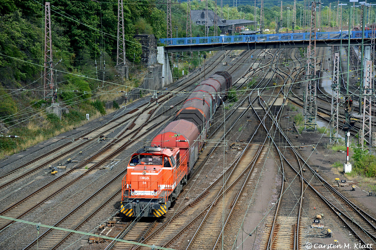 Zwischen 2017 und 2019 wurde durch DB Montan-Kunden das Lager der Fa. Stahlform Schulte in Hüsten West auch zur Zwischenlagerung von Coils genutzt. Nachmittags gab es regelmäßig einen durch die RLG traktionierten Abgangswagenzug nach Hagen Vorhalle. So auch am 16.08.2019, als Carsten Klatt RLG 54 bei der Einfahrt im Zielbahnhof aufnehmen konnte.