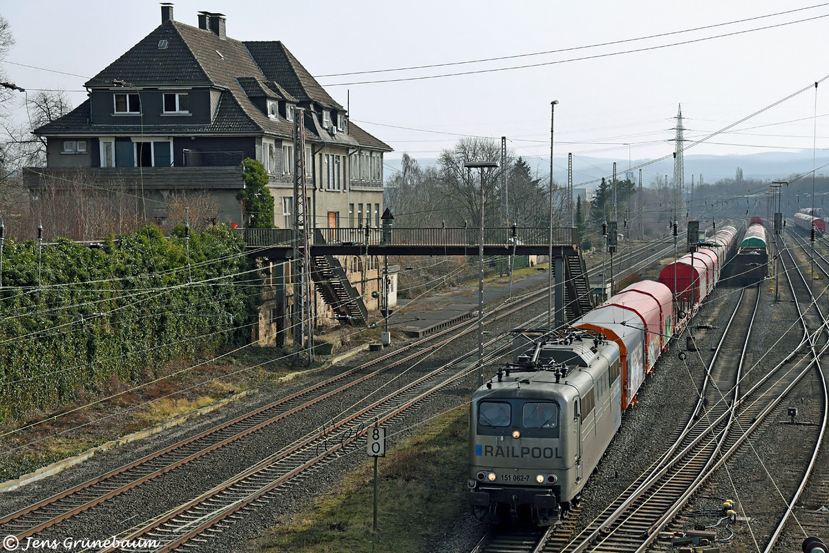 Der Münchner Lokvermieter Railpool übernahm in 2017 zweihundert Altbau E-Loks der Baureihen 151 und 155 von DB Cargo. Die Gütersparte mietete bei Bedarf davon einige Maschinen zurück, wie die in Railpoolfarbgebung lackierte 151 062, die Jens Grünebaum am 03. März 2021 mit dem EZ 51412 ausfahrend Hagen Kabel aufnehmen konnte.