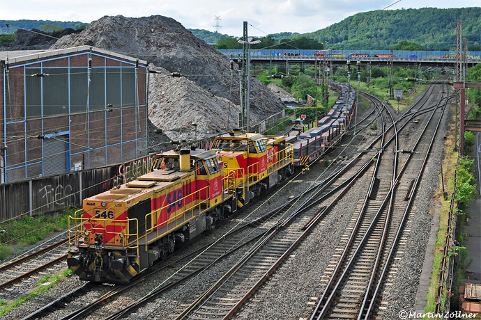 Im Jahr 2024 wird der Brammenzug von Duisburg Hütte KM zum Hoeschwerk in Hohenlimburg mit Loks der TKSE in Doppeltraktion gefahren. Am Nachmittag des 04. Juni waren die Maschinen 546 und 545 vorgespannt, als sie bei der Einfahrt Hagen Kabel mit der Kamera beobachtet werden konnten.