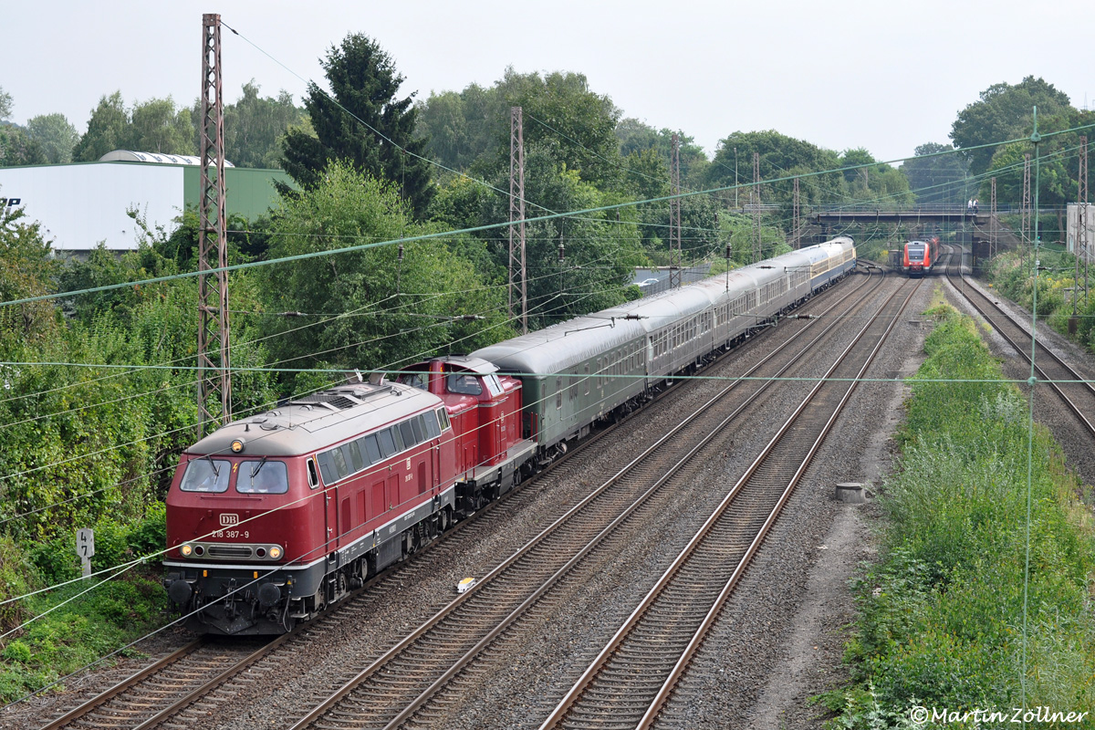 Am 03. September 2012 setzt der im Oberen Ruhrtal bis Schwerte Ost der Fahrzeugrückführung vom KHB-Streckenfest Korbach im Blockabstand gefolgte RE 3908 auf der Hauptstrecke (2550) zur Überholung an. Etwas gemächlicher ist dann der sehr lange, von der Kurhessenbahn-218 387 geführte DLr 20285 auf den Gütergleisen (Strecke 2823) in Hagen-Bathey Richtung Hagen Gbf unterwegs. Der 1975 stillgelegte Haltepunkt Hohensyburg ist heute nur noch zu erahnen.