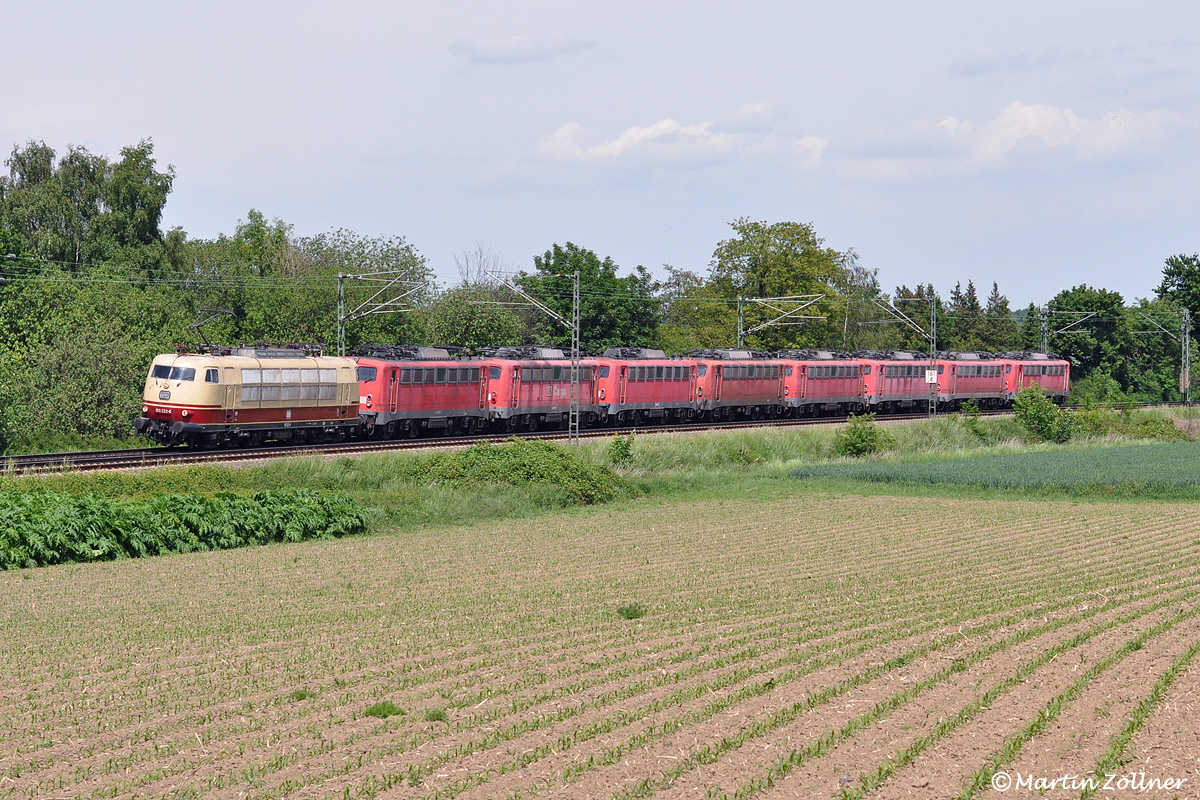 Am 29. Mai 2010 hat der edele Renner 103 222 der Mindener DB-Systemtechnik die traurige Aufgabe, acht Elektroschwestern der E 40-Gattung von Seelze zum Schrottverwerter nach Opladen zu bringen. Im jungen Maisfeld am Sölderholz stehen auch schon drei Fotografen bereit, der vorüberziehenden Fracht die letzte Ehre zu erweisen.