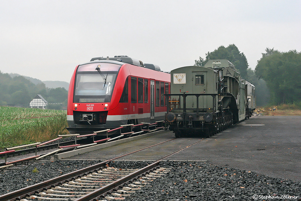 Seltenes Aufeinandertreffen am Nachmittag des 06. September 2018 am Anschluss RWE Hennen: Während rechts in der Anst ein ausgemusterter, 1971 gebauter 160 Tonnen-Trafo aus dem UW Bixterheide auf seinen Abtransport zum Schrotthändler wartet, fährt links 648 006 als RB 14931 nach Iserlohn im Regen zum Hennener Bahnsteig vorbei.