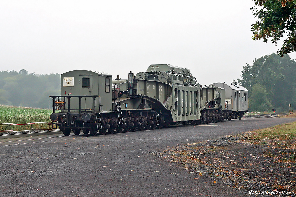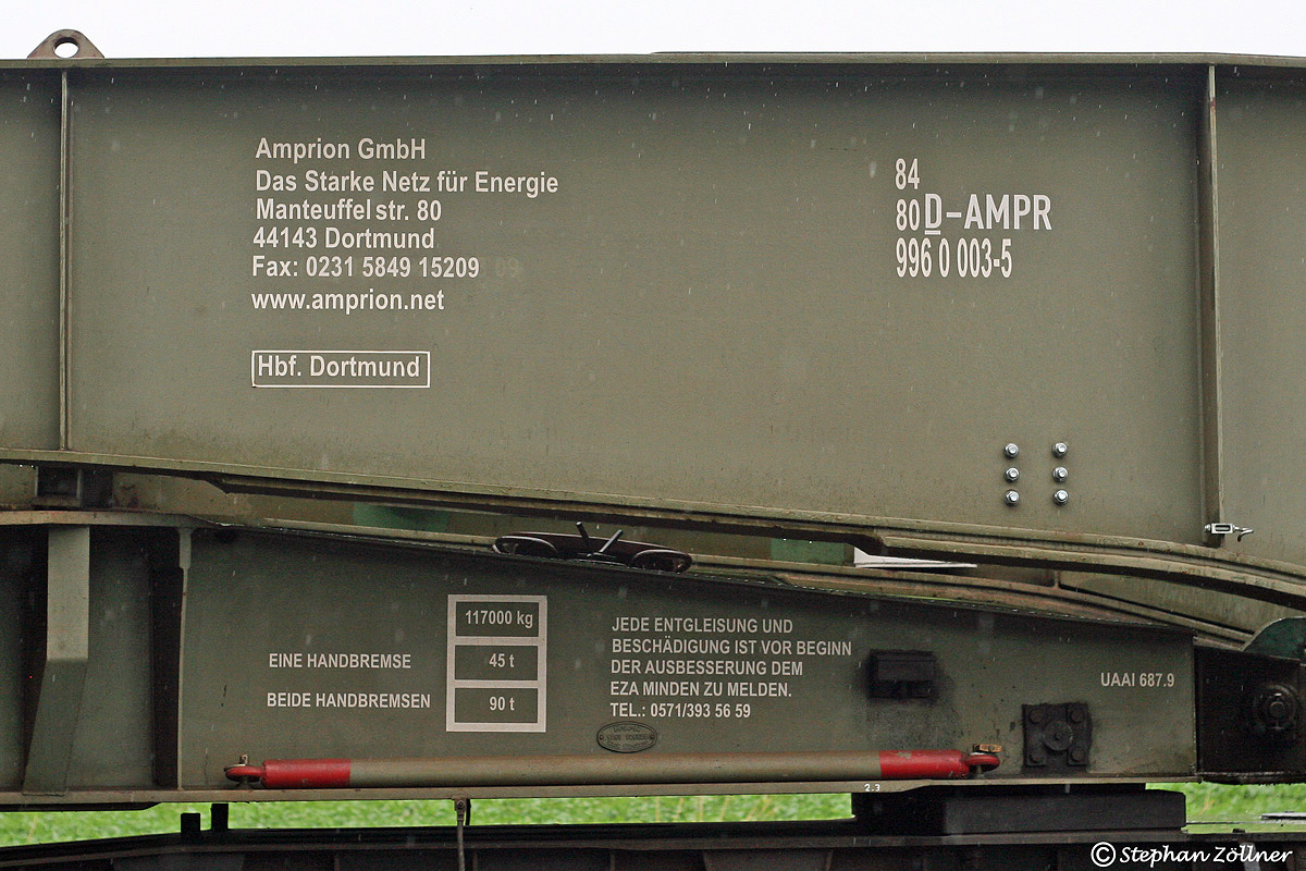 Fertig verladen steht er da, der 1971 gebaute und nun im UW Bixterheide ausgemusterte Trafo der niederländischen Firma smit nijmegen. In der Nacht wird er mittels des Amprion-Tragschnablwagens 996 0 003 seine letzte Reise zum Verschrotten bei der Fa. Bender in Opladen antreten. Bild in der Anst RWE Kalthof-Hennen, 06.September 2018.