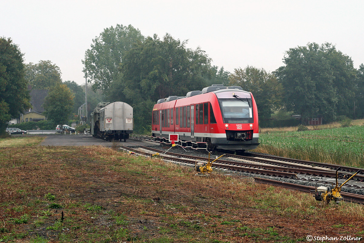 Die Gerätschaften zum Umbau der weichenlosen Verbindung an der Anst RWE Kalthof-Hennen liegen am Nachmittag des 06.09.2018 schon bereit, um in der darauffolgenden Nacht den Alttrafotransport nach Opladen dort herauszulassen. 648 001 kann als RB 14934 nach Dortmund noch ungehindert passieren.