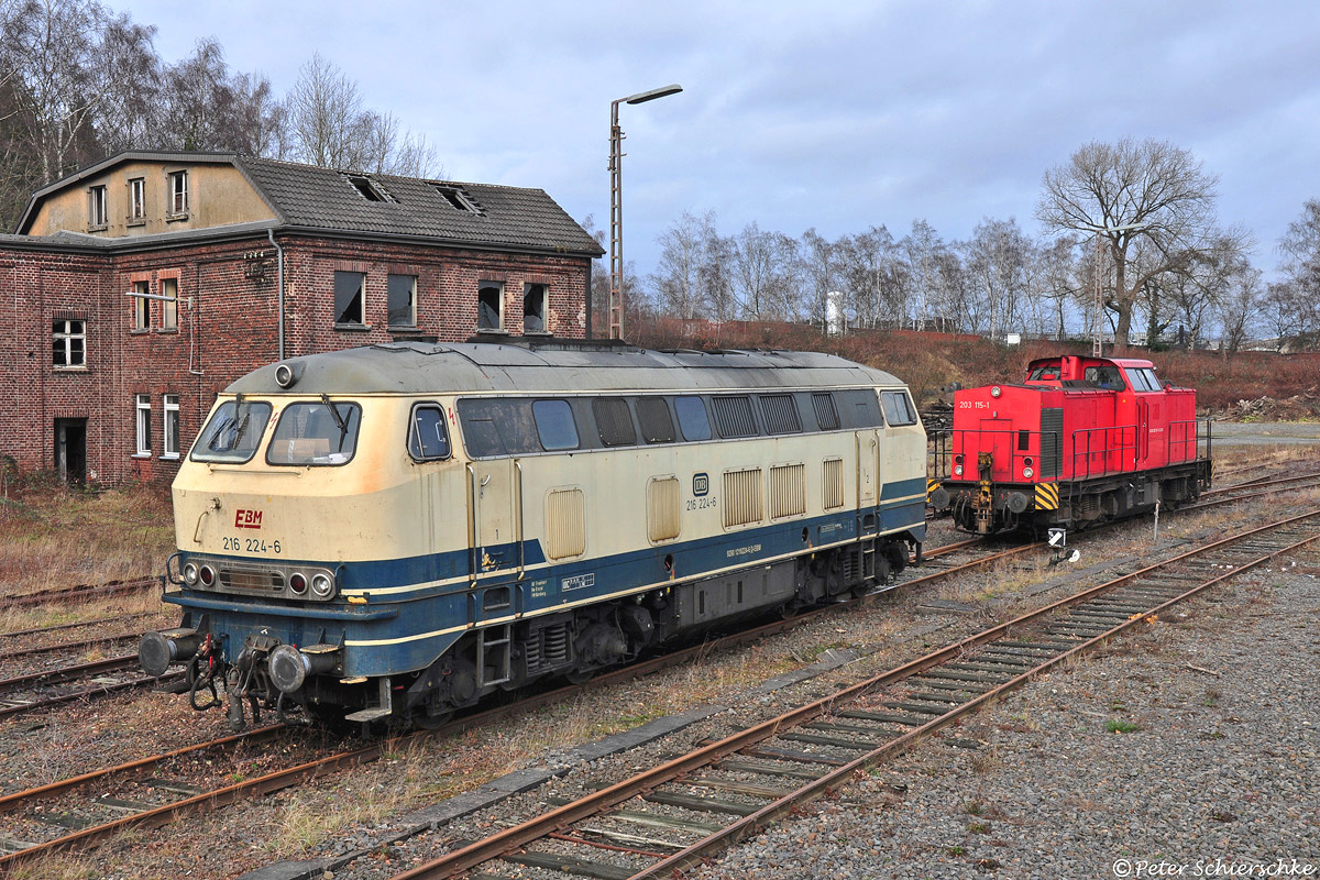 Direkt neben der heute eingleisigen Verbindungsbahn Abzweig Hohensyburg – Schwerte Ost befinden sich die Reste des ehemaligen, einst mit Rundlokschuppen ausgestatteten Bahnbetriebswerkes Schwerte. Peter Schierschke konnte dort am 11.01.2012 die zur EBM (Eisenbahngesellschaft Mittelrhein EBM Cargo GmbH) gehörenden, ehemaligen DB-Loks 216 224 und 203 115 (ex 202 450-3, seit 07.03.2011 EBM) auf den heruntergekommen wirkenden Gleisanlagen geparkt aufnehmen.