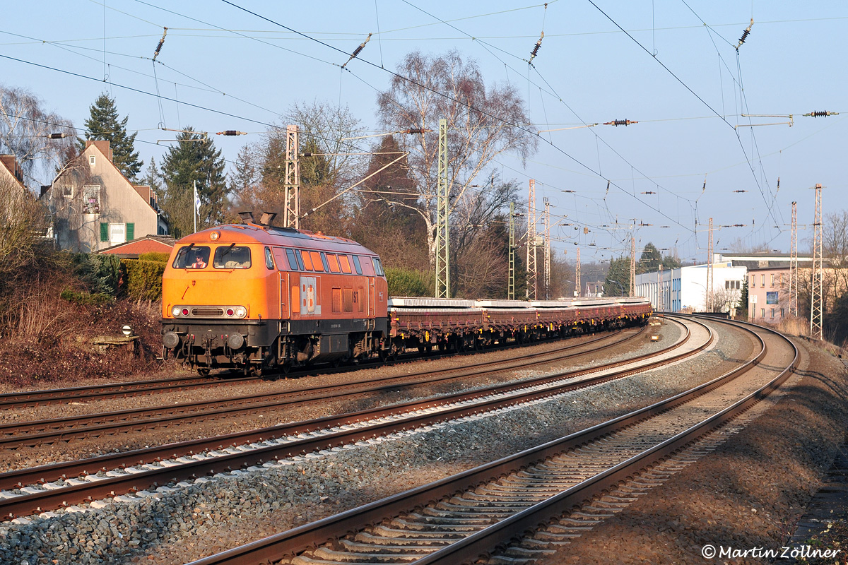 Über die Osterfeiertage 2016 fanden zwischen Meggen und Altenhundem auf der Ruhr-Sieg-Strecke Gleiserneuerungsarbeiten statt. Am Abend des 17. März kommt Lok 17 der BBL (ex DB 225 099) eine halbe Stunde vor Sonnenuntergang mit einer Ladung neuer Betonschwellen auf dem Weg nach Finnentrop auf den Gütergleisen in Westhofen durchgefahren.