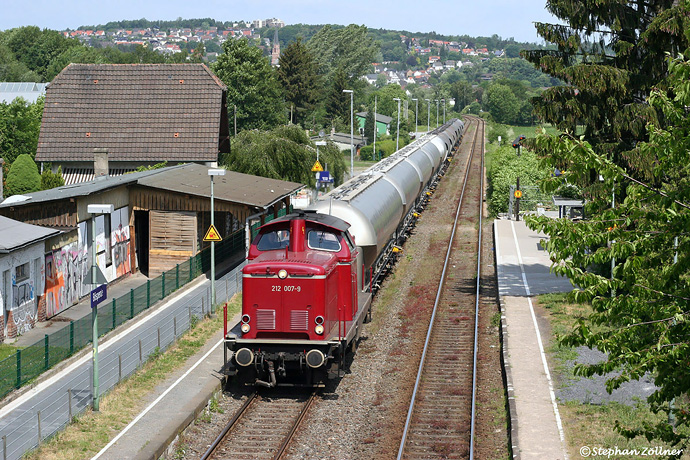 Am 26. Mai 2011 wurde mal wieder dem HVLE-Braunkohlestaubzug nachgestellt, und zwar diesmal im Bereich des Haltepunkts Bösperde. Mit dem zweiten Zugteil röhrt 212 007 dort kurz nach Mittag vom Schwerter Güterbahnhof kommend auf Menden zu.
