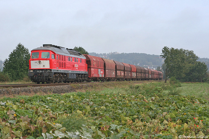 Früh dran war am 15.09.2011 die Kalkzugleergarnitur CS 61390 zur Horlecke. Hinter der Regionalbahn nach Neuenrade konnte gegen ¼ vor Neun dieses Bild bei sich auflösendem Hochnebel in Höhe der ehemaligen Anschlussstelle Neuwalzwerk bei Bösperde angefertigt werden. Der "Hollandlatz-Großrusse" 904 stellte an diesem Donnerstag die Bespannung sicher.