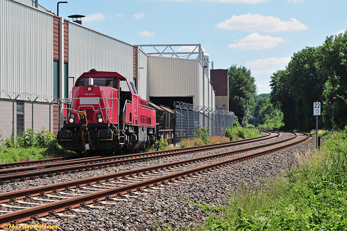 Am Nachmittag des knapp 30 ºC heißen 26. Juni 2020 nimmt 265 022 die werktägliche Bedienung der Anst Kabel Metall Europa in Menden vor, als sie gerade vier speziell für den Kupferverkehr hergerichtete Samms-Wagen aus der Werkshalle abzieht. Diese mit Containermulden für Kupferschrott und Ladegestellen für Kupferzylinder ausgestatteten Wagen kommen ausschließlich im Pendelverkehr zwischen der Kupferhütte und dem Kabelwerk zum Einsatz.