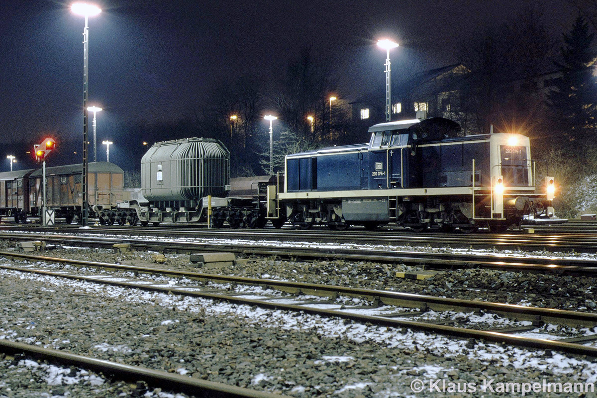 Am Abend des 17. Dezember 1990 steht 290 075 mit einem in Hemer aufgelasteten 110 kV-Trafo aus dem UW Sümmern in Menden zur Abfahrt nach Schwerte bereit. Für das seltene Transportgut des mit eigenartigen Kühlrippen ausgestatteten Schwergewichts wurde ein sechsachsiger Tiefladewagen genutzt. Klaus Kamplemann konnte die Fuhre in die abendliche Übergabe nach Schwerte eingereiht bildlich für die Nachwelt festhalten.