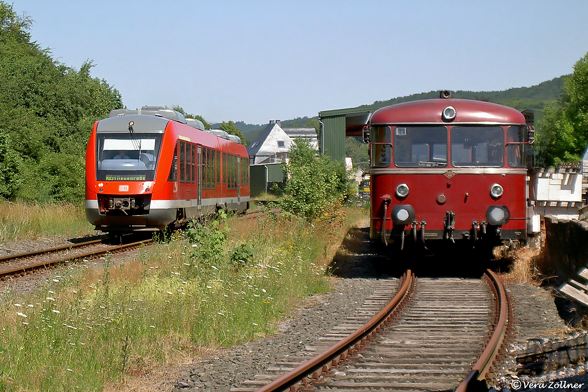 Das letzte Nebengleis südlich von Horlecke im Verlauf der Hönnetalbahn findet sich in Balve. Einst für Trafotransporte vorgehalten, bedient sich hier gerne mal die Schienenbusgarnitur des FSB Menden einer Zwischenabstellgelegenheit bei Sonderfahrten. Am 02.07.2006 ist die komplette Garnitur 796 690+996 299+996 309+796 802 als DPE 88976 nach Balve gekommen, daneben rollt der moderne Nachfahre in Form von 648 109 als Regionalbahn nach Neuenrade vorbei.