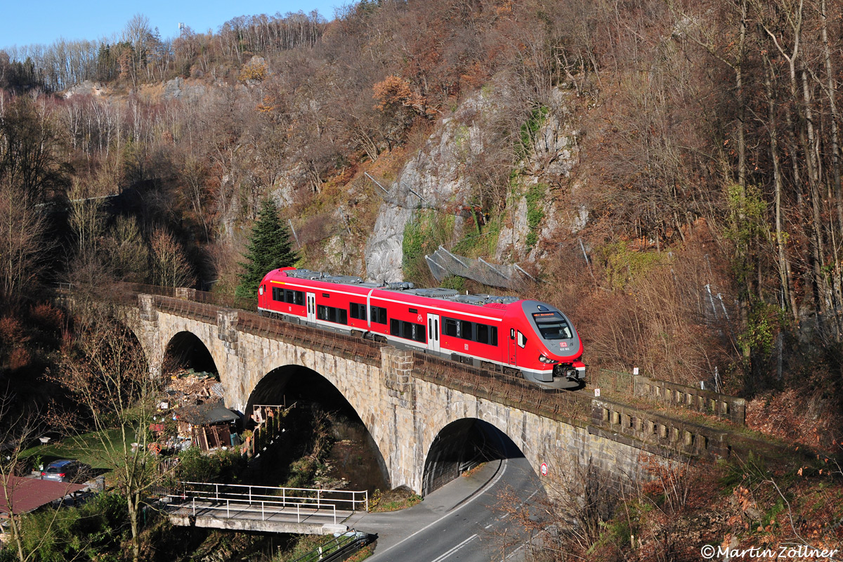 Der mittägliche Personenzug von Fröndenberg nach Neuenrade konnte am 17. November 2018 auf dem Hönneviadukt vor dem Uhutunnel bildlich verhaftet werden. Samstags verkehrt dieser Zug nicht als Schülerzugdoppeleinheit, sodass er perfekt ins Motiv eingepasst werden konnte.