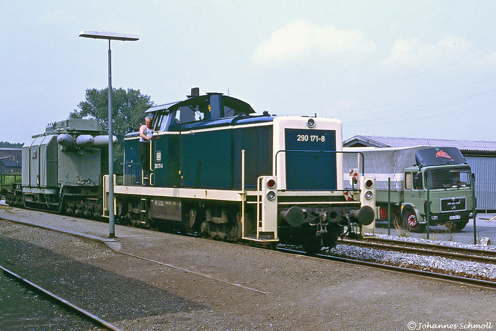 Am 09. August 1988 konnte Johannes Schmoll den Übergabezug ins Hönnetal mit einer besonderen Fracht in Lendringsen bildich verewigen: 290 171 hatte an diesem Tag die Aufgabe, einen neuen 110 kV-Trafo für den Neubau des Umspannwerks nach Balve anzuliefern. Die Last ist auf den Älteren der beiden jeweils achtachsigen Uaais 779 (994 5 900) aufgelastet.