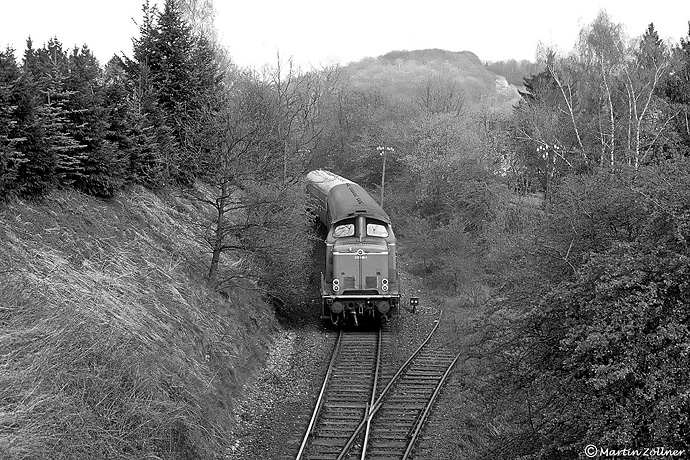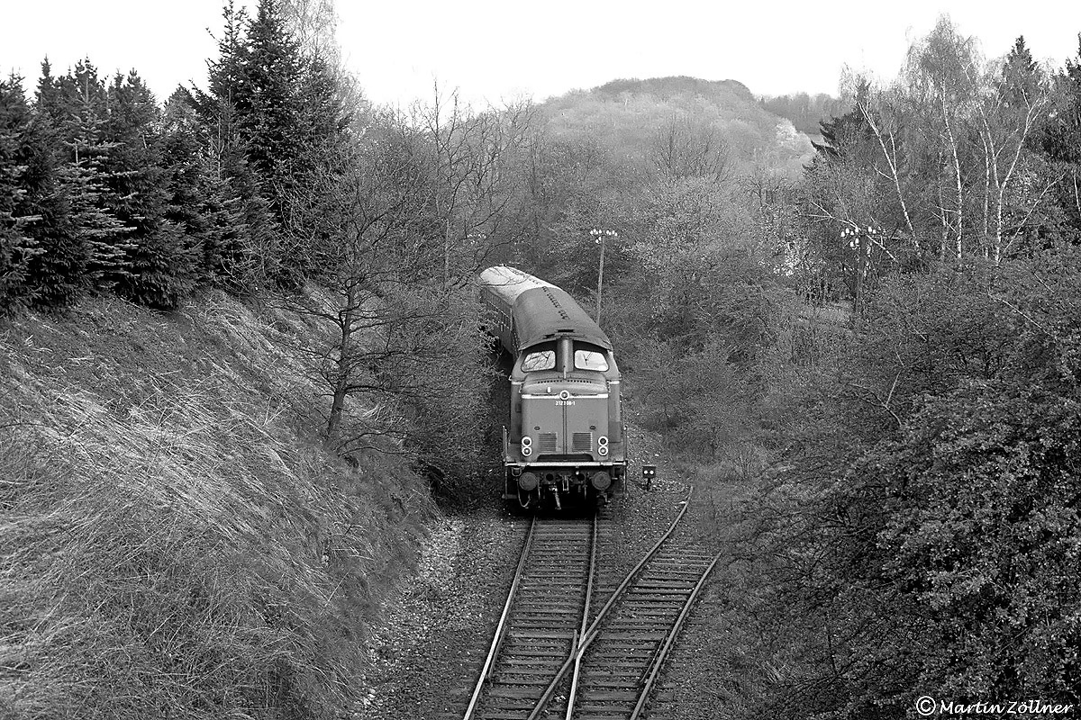 Erste Blätter sprießen schon an den Bäumen, als 212 308 mit dem N 6473 Unna – Neuenrade am 07. April 1990 die noch vorhandene Weiche des ehemaligen Anschluss Allhoff an der Einfahrt Balve passiert.