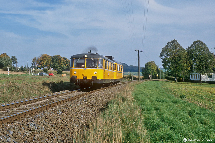 In frischem Lack zeigt sich der Opladener Gleismesszug 004, als er aus dem Haltepunkt Küntrop Richtung Neuenrade ausfahrend für die Nachwelt bildlich festgehalten wurde. An diesem 09. Oktober 1990 stehen die Strecken 2850, 2852 und 2853 zur jährlichen Gleislageüberprüfung an. Angeführt vom 725 004 (Uerdingen 66568 ⁄ 1959) hat die Messfahrt samt 726 004 (MBB 09029 ⁄ 1974) wenige Minuten später den Endpunkt der Hönnetalbahn erreicht.