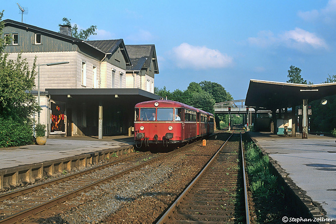Vor dem Mendener Bahnhofsgebäude posierte am 15. Mai 1993 die Schienenbusgarnitur 998 880, 998 172 und 798 629 in der Abendsonne. Für die Eisenbahnfreunde Hönnetal hatte sie eine Sonderfahrt über die ehemalige Kursbuchstrecke 249 von Scherfede nach Holzminden durchgeführt.