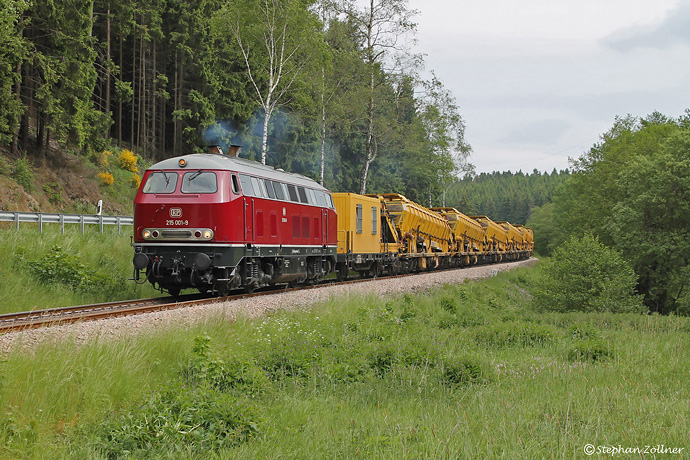 Am Nachmittag des 16. Juni 2015 arbeitet sich 215 001 mit dem Bettungsreinigungszug im Zuge der Erneuerung der Winterberger Strecke vom Endpunkt kommend am Remberg auf Silbach zu und konnte dabei bildlich für die Nachwelt festgehalten werden.