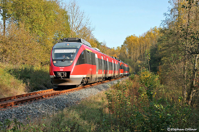 Strahlend blauen Himmel gab es auch am 19. Oktober 2017. Am Nuttlarer Sportplatz ließen sich um kurz nach Drei 644 053 und 001 als RE 10766 auf dem Weg nach Dortmund auf dem Kamerachip verewigen.