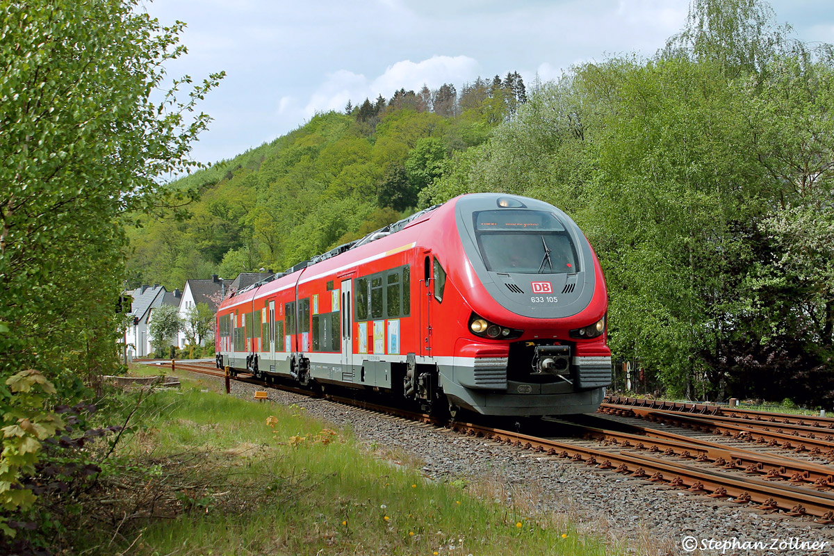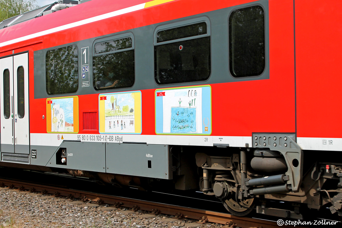 Zum Weltkindertag am 20.09.2021 hatte DB Regio NRW zusammen mit dem Verlag Bachem aus Köln einen Malwettbewerb für Schüler der 3. Klassen unter dem Motto "Mein schönster Tag mit der DB Regio NRW" entlang der Linie S 6 (Köln – Essen) und im Dortmund-Sauerland-Netz ausgelobt. 35 Bilder wurden unter den Einsendungen ausgesucht und jetzt auf zwei Züge geklebt. Beim RE 57 ist dies der 633 105, hier aufgenommen am Abzweig Nuttlar mit Datum vom 10. Mai 2022.