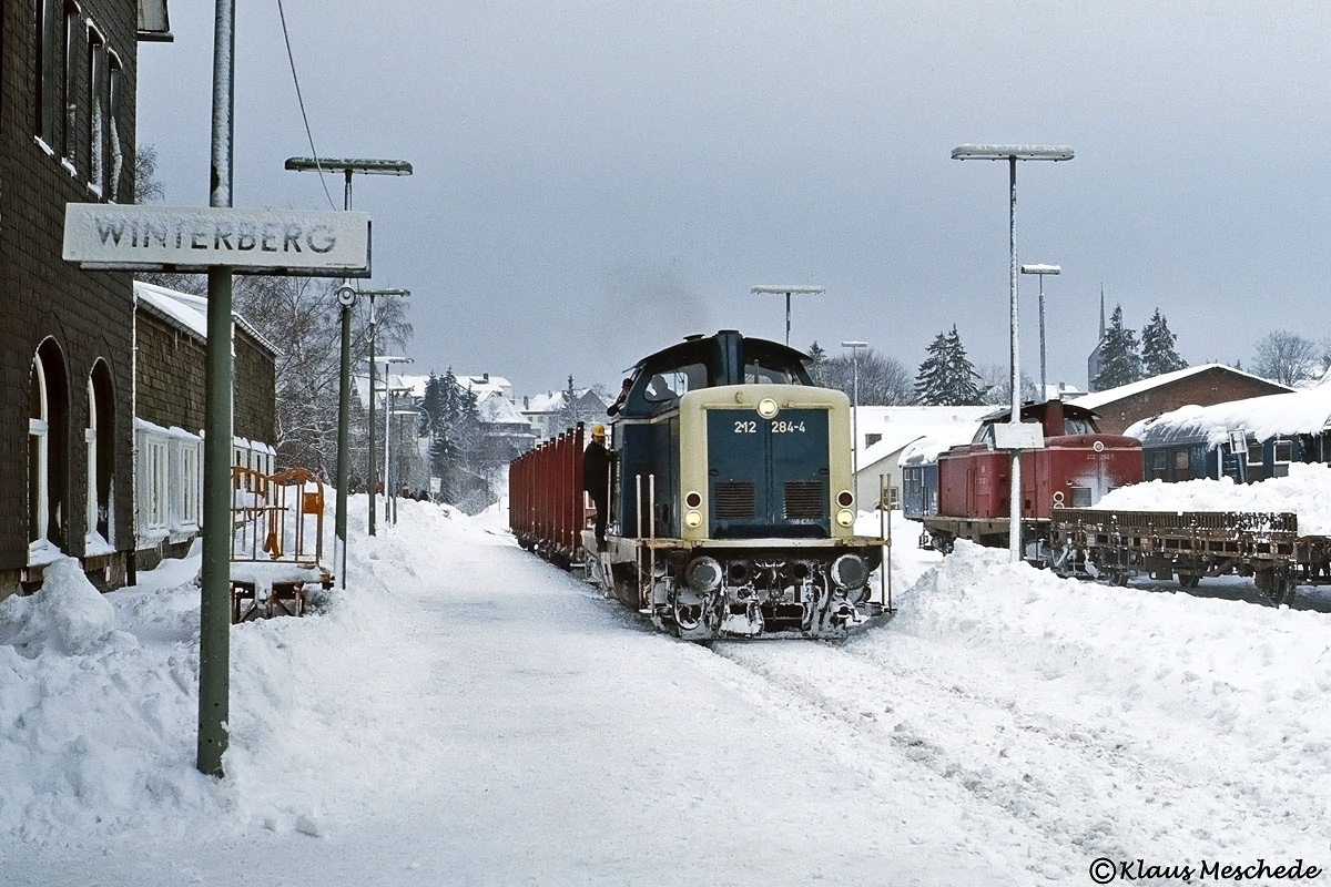 Kleines V 100 Treffen in Winterberg Anfang Januar 1984. Während 212 284 mit der Übergabe aus Hallenberg am Bahnsteig eintrifft, wartet die altrote 212 292 vor dem damals legendären Schneeräumzug schon auf das Freiwerden der Strecke, um die per Bagger im Bahnhofsbereich auf die K-Wagen aufgeladenen Schneemassen im Nuhnetal zu entsorgten.