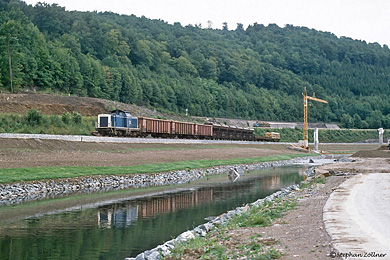 Frisch begradigt für den Brückenneubau der Bundesstrasse 480 zeigte sich die Ruhr im Bereich unter dem Nuttlarer Ochsenberg am 29. August 1989. Auf den ebenfalls umgelegten Gleisen rollt die lange Übergabe aus Hallenberg auf Nuttlar zu. |