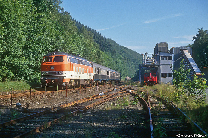 Im Juni 1990 gab es an der Schotterverladung in Steinhelle nichts zu tun. Am Morgen des 26. fuhr 218 135 mit dem E 3683 nach Winterberg dort an der arbeitslosen MHI-Werklok vorbei.