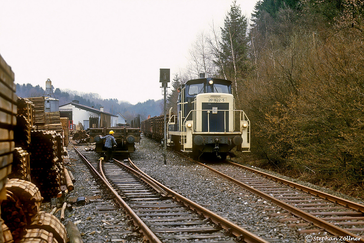 Auch am 13. April 1987 war der Abrisstrupp im Frettertal aktiv. Wieder hat 261 622 Nachschub an leeren Rs-Wagen nach Deutmecke gebracht und gegen die vollen getauscht. Nach dem Verschluss der Gleissperre geht es sofort nach Finnentrop zurück.