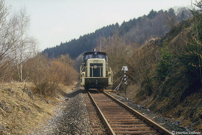 Am 14. April 1987 fuhr 261 622 leer nach Deutmecke, um dort die fertig beladenen Wagen mit abgebauten Gleisjochen abzuholen. Martin lichtete sie an der dortigen Trapeztafel ab.