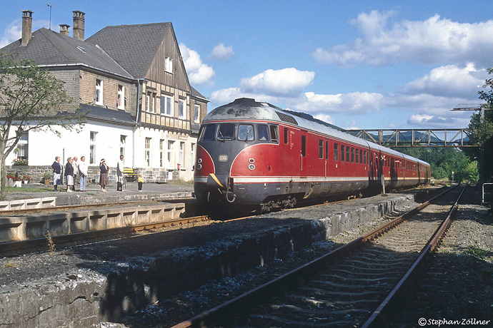 Am 04. September 1988 gab es die große Charterfahrt der Eisenbahnfreunde Obere Ruhrtalbahn von Braunschweig ins Hochsauerland. Der Braunscheiger Museums-VT 08 absolvierte dabei auch mehrere Pendelfahrten zwischen Schmallenberg und Fredeburg. Vor dem ehemaligen Empfangsgebäude von Fredeburg ist die Einheit als DZt 28744 in der Nachmittagssonne gerade zum Halten gekommen.