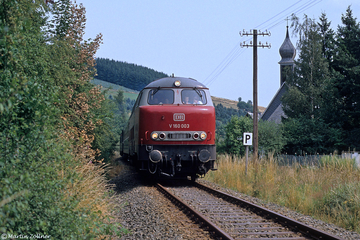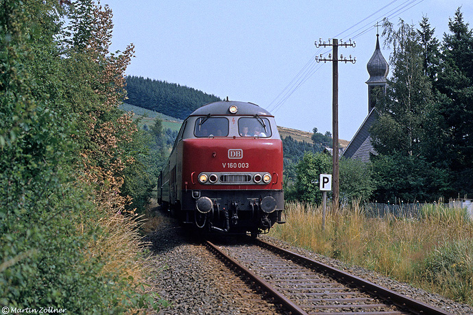 Anfang März 1984 wurde mit 216 003 die letzte Prototypmaschine der Bauart V 160 bei der DB abgestellt. Seit 31.07.1985 betriebsfähig zum DB-Museumsbestand zählend, gelangte die "Lollo" 003 gelegentlich noch einmal mit Sonderzügen ins Hochsauerland, während sie heutzutage vom Standort Lübeck aus kaum "Auslauf" bekommt. Am 29. Juli 1989 rollt sie mit Lokführernachwuchs besetztem Führerstand an der Gleidorfer Kapelle vorbei auf den Zielbahnhof Schmallenberg zu.