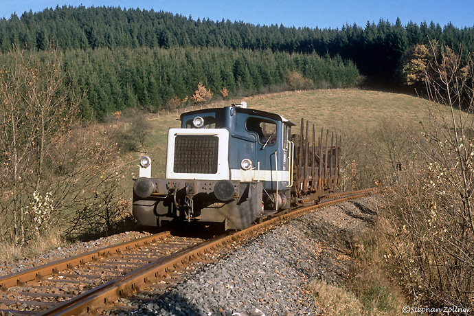 Am 20. November 1989 war die Planlok der Schmallenberger Übergabe verhindert, sodass ausnahmsweise die Neheimer Bahnhofsköf 332 134 mit der Bespannung betraut wurde. Nachdem bereits Schnittholz in Bremke und Eierkohlen in Dorlar zugestellt wurden ist das Tagesziel Gleidorf mit einer Ladung Briketts nur noch 700 Meter entfernt, als der Damm oberhalb des Ortes überquert wird.