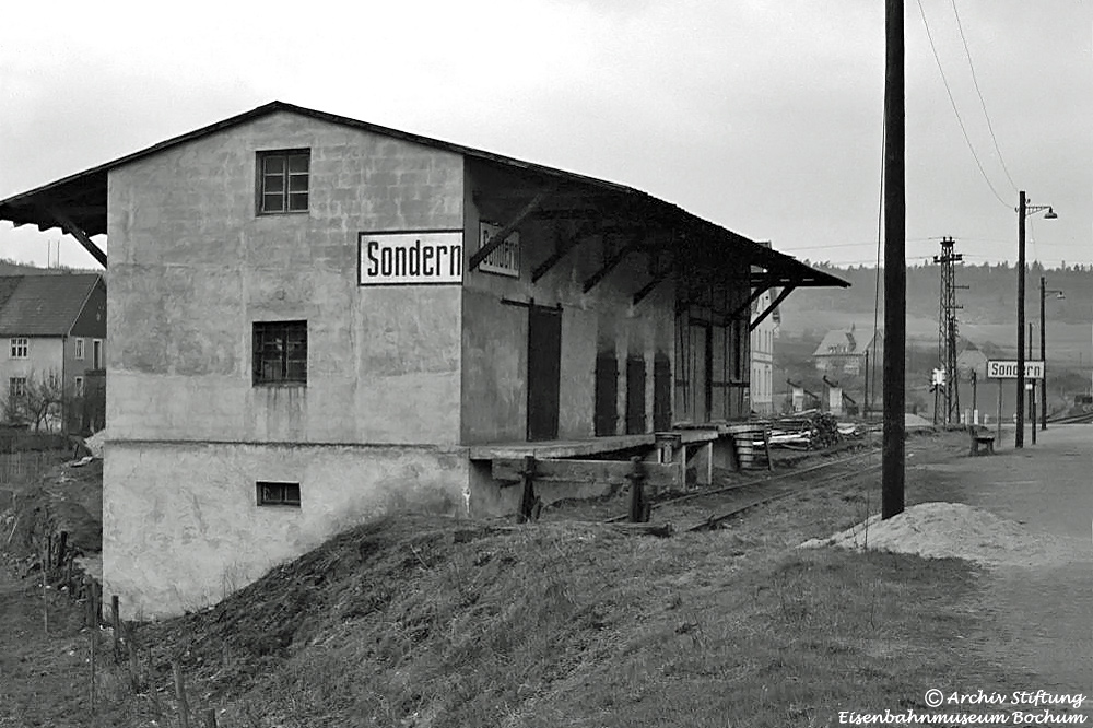 In Sondern gab es in den fünfziger Jahren den obligatorischen Schüttbahnsteig mit Ruhebank, Fahrplanaushang sowie drei Lampen zur Beleuchtung. Außerdem war dort ein kleiner Güterschuppen mit kurzem Ladegleis sowie einer Weiche vorhanden, Bild in Richtung Olpe aufgenommen.