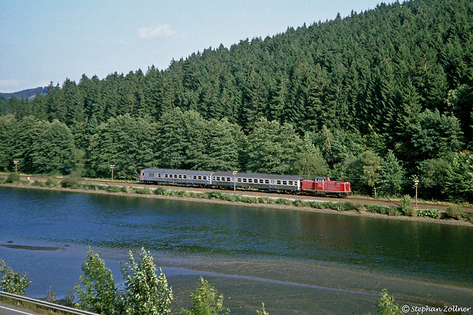 Die Biggetalstrecke nach Olpe führt in der Nähe des Hof Biggen entlang des Ahauser Stausees. Von oberhalb der Finnentroper Straße konnte man am 07. Oktober 1984 noch bewuchsfrei Aufnahmen von den mit Hagener V 100 bespannten Wendezügen anfertigen. So kam auch der N 6728 von Finnentrop nach Olpe mit 212 308 aufs Bild.