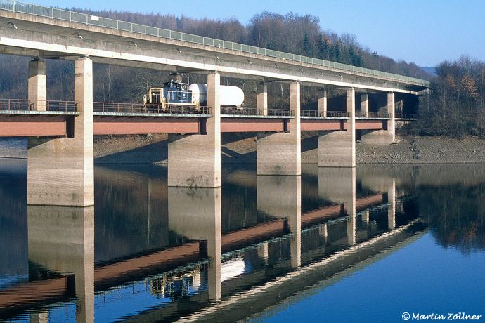 Einzigartig sind die beiden Anfang der Sechziger Jahre im Zuges des Baus der Biggetalsperre entstandenen Doppelstockbrücken (oben Straße, unten Schiene) bei Eichhagen. Der Güterverkehr im Biggetal ist jedoch Geschichte. Am 09. Februar 1989 ist die Finnentroper V 60 mit einem einsamen Gasdruckkesselwagen auf dem Weg nach Eichen an der Drolshagener Strecke, als sich die Fuhre bei nicht ganz windstiller Witterung auf der Dumicketalbrücke im Biggesee spiegelt.