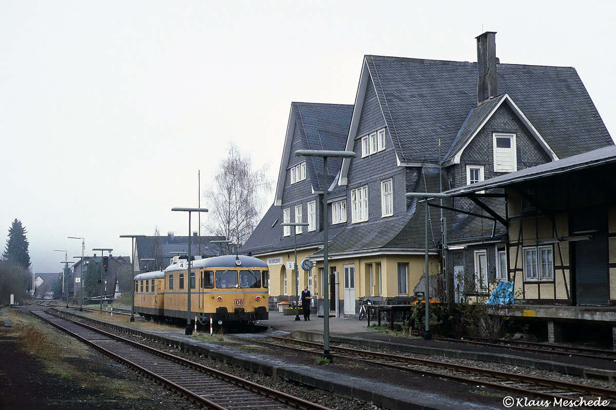 Morgens um halb zehn in Deutschland, genauer gesagt um 09.23 Uhr in Bad Berleburg am nebeligen 18. April 1998: Zur kurzen Wendepause vor dem Bahnhofsgebäude hat sich der auf Messfahrt im Rothaargebirge befindliche Gleismesszug 004 eingefunden, als Klaus Meschede auf den Auslöser seiner Kamera drückt. Alle Nebengleise sind zu diesem Zeitpunkt bereits vom Streckennetz abgebunden.
