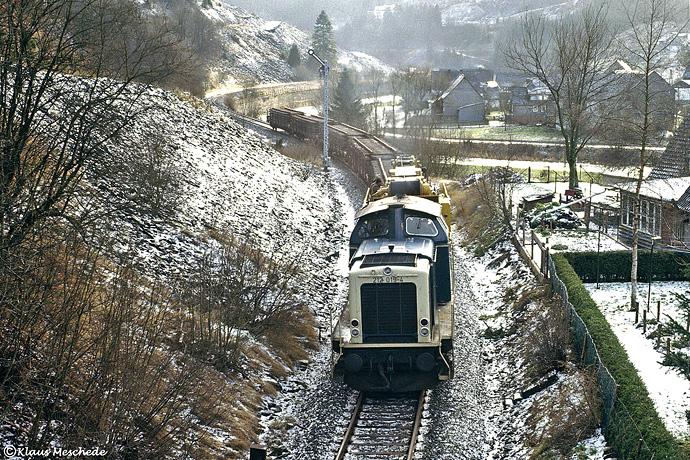 Mit der Tagesleistung des 29. Dezember 1982 kehrt die Siegener 212 019 samt Kran und Abbauzug nachmittags am Blocksignal der Abzweigstelle Hörre von der Oberen Edertalbahn nach Bad Berleburg zurück. Klaus Meschede stand auf der Brücke "Pfarrwiese" in Raumland und lichtete die Fuhre ab.