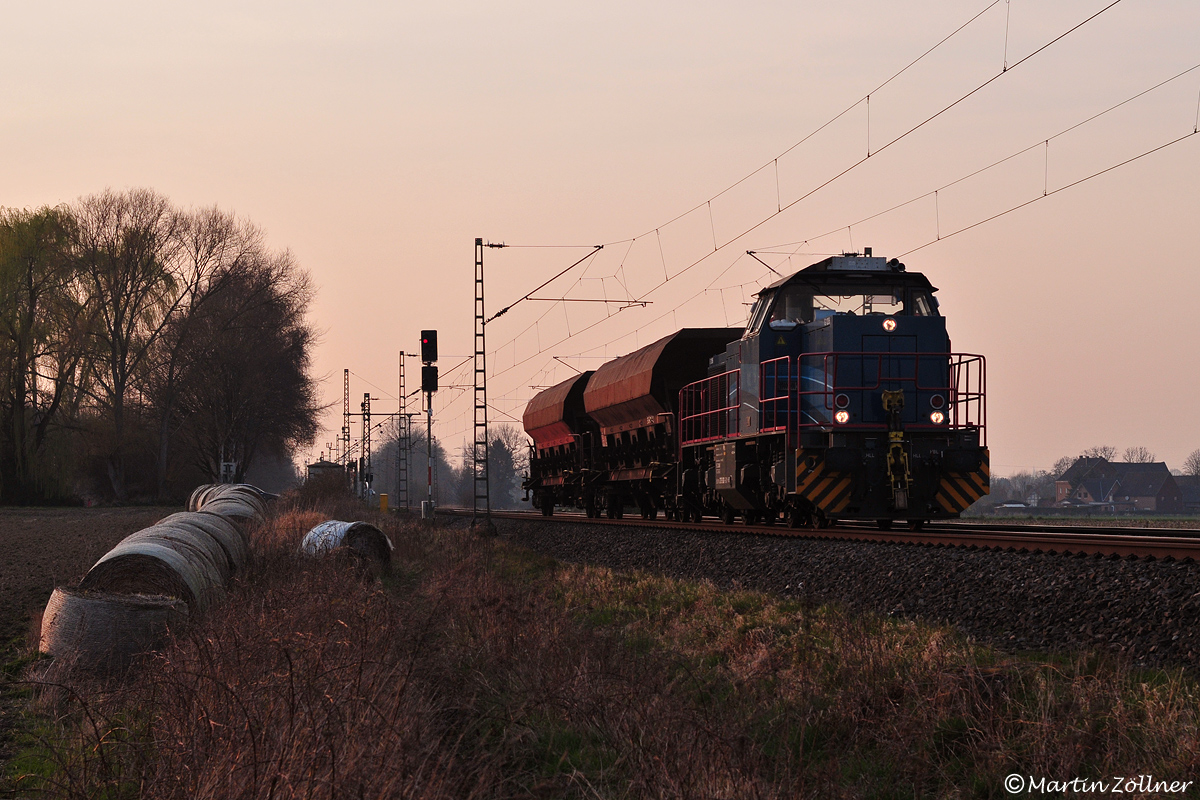 Der Tag geht - die HGB kommt. Zum Sonnenuntergang verläßt 275 502 der Hessischen Güterbahn mit zwei Wagen Schotter für die Gleisbaustelle im Paderborner Güterbahnhof den Betriebsbahnhof Rhynern. Hier existiert zum Ein- und Ausfädeln von Güterzügen von und zum Hammer Rangierbahnhof in den Personenverkehrsfahrplan das letzte nutzbare Nebengleis an der Strecke Hamm - Soest.