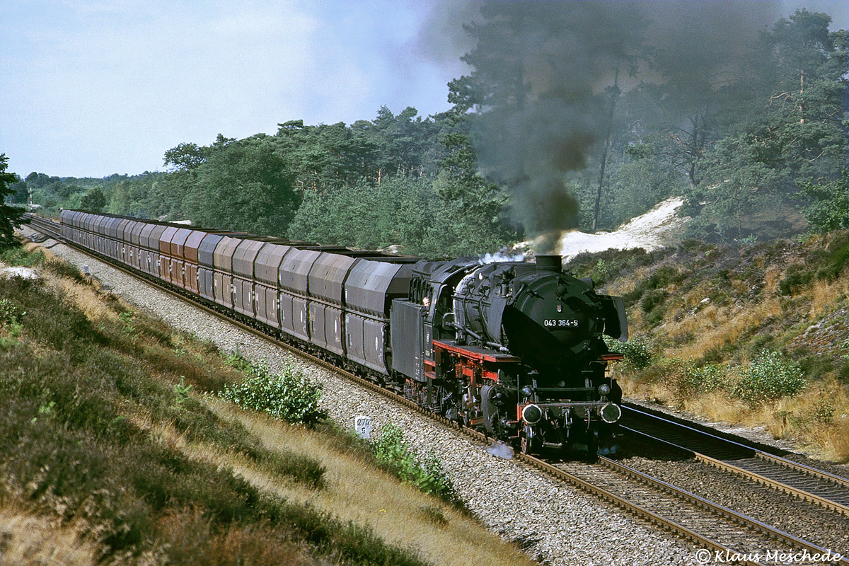 Welchen Eisenbahnfreund der 70er Jahre hat es hierhin nicht verschlagen, an die Emslandstrecke zu den schweren Ganzzügen mit den Öl Jumbos der BR 043 ? Im Einschnitt bei Lathen konnte Klaus Meschede am 29. Juli 1976 zuschlagen und 043 364 entsprechend für die Nachwelt festhalten.