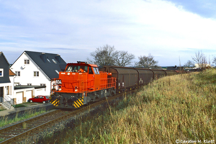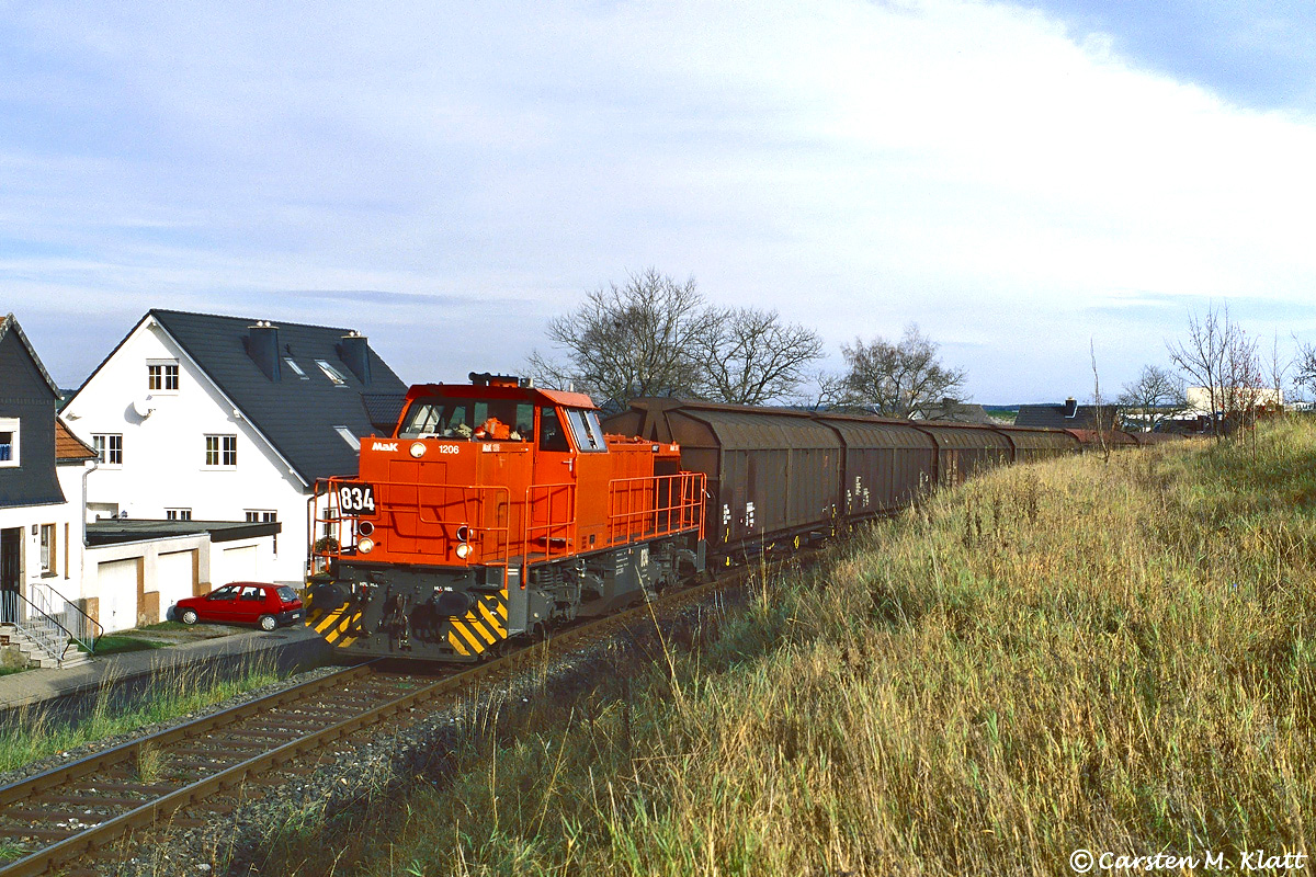 Ab Herbst 2006 waren vor dem Eggerzug durch Railion gemietete MAK G 1206 Dieselloks im Einsatz. Carsten Klatt erwischte die hier nur zwei Monate tätige RAG 834, bei der DB als 266 834 bezeichnet, mit dem TK-FZT 54388 bei der Einfahrt nach Brilon Stadt am Gallbergweg. Aufnahme vom 24.November 2006.