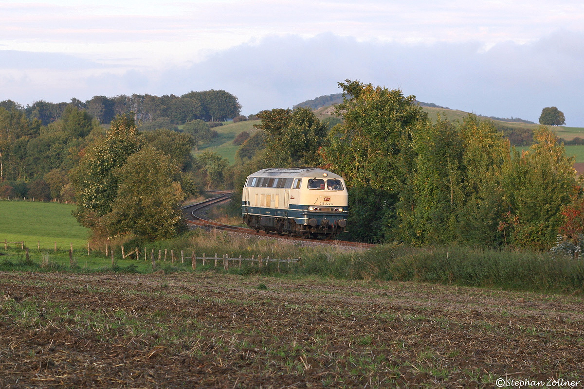 Aufgrund der Sichtung einer V 160 im Eggerwerk wurde am Nachmittag des 01. Oktober 2010 "alarmmäßig" nach Brilon aufgebrochen. Und tatsächlich stand dann die EBM-216 224 hinter der Anschlussweiche Anst Egger 3 abgestellt. Nachdem die Maschine später aufgerüstet wurde, ging es über die Umgehungsstrasse schnell zum Briloner Golfplatz, wo die Lok gegen 18.10 Uhr in den allerletzten Sonnenstrahlen des Tages nochmals bildlich festgehalten werden konnte.